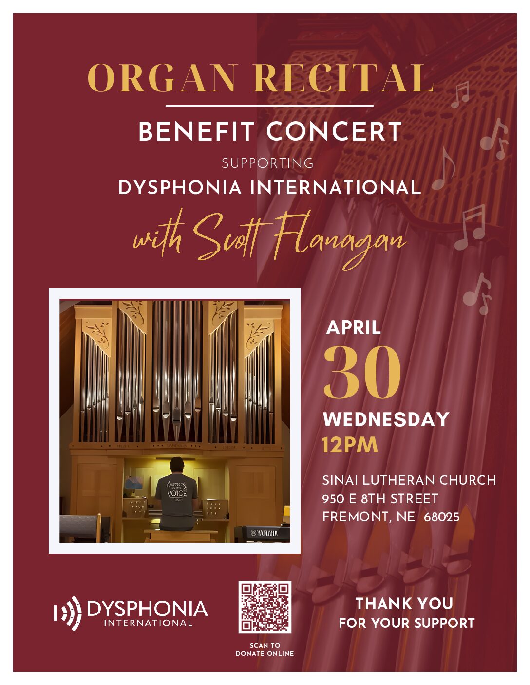 Join us for a benefit concert supporting Dysphonia International on Wednesday, April 30, 2025, at 12:00 PM. LOCATION | Sinai Lutheran Church 950 E 8th Street, Fremont, NE